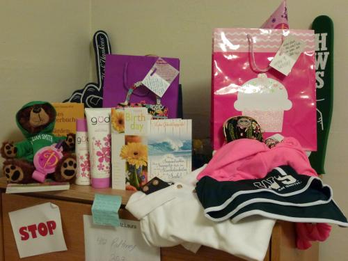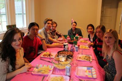 Die beiden "Dutch Guys" hatten sogar ein Geschenk für mich - ein HWS Bär. Süß!!! Die Überraschung ging weiter, als Irene und Bora kamen und auch die beiden hatten Geschenke für mich. Damit hatte ich wirklich nicht gerechnet. Zu guter Letzt kam auch Lizzy (die nächstes Jahr an der Uni Bremen studieren wird und die wir schon jetzt ins Herz geschlossen haben). Der perfekte Geburtstag! Es wurde aber noch besser, Nathalie und Finja haben selbst den Kochlöffel geschwungen und ein köstliches Mahl zubereitet :) Zum Dessert habe ich dann eine pinke, original amerikanische Geburtstagstorte mit einer 26-Glitzer-Kerze bekommen! Man beachte: das Frosting, also die Dekoration der Torte, haben die beiden Mädels selbstgemacht. Respekt Girls!